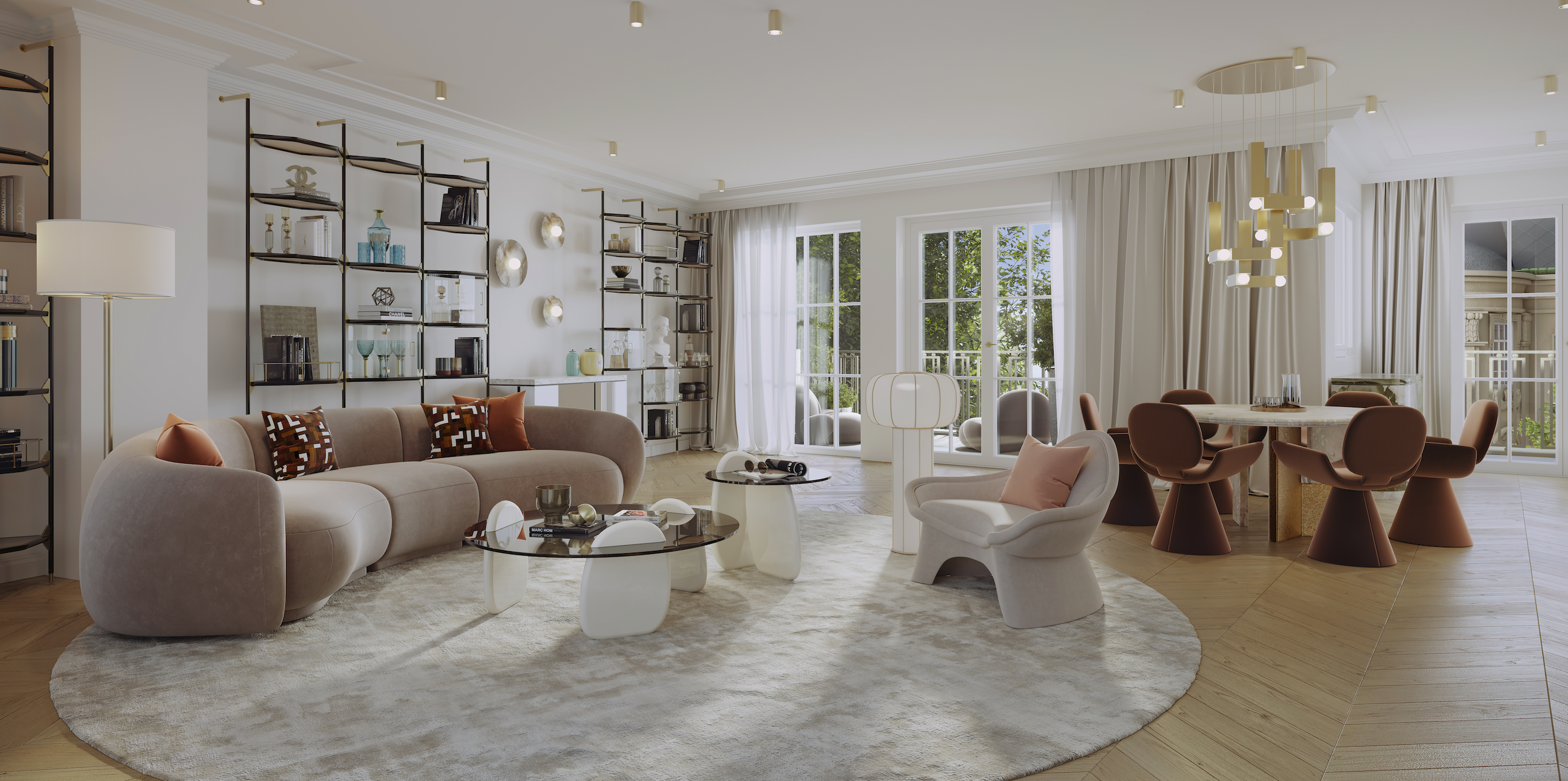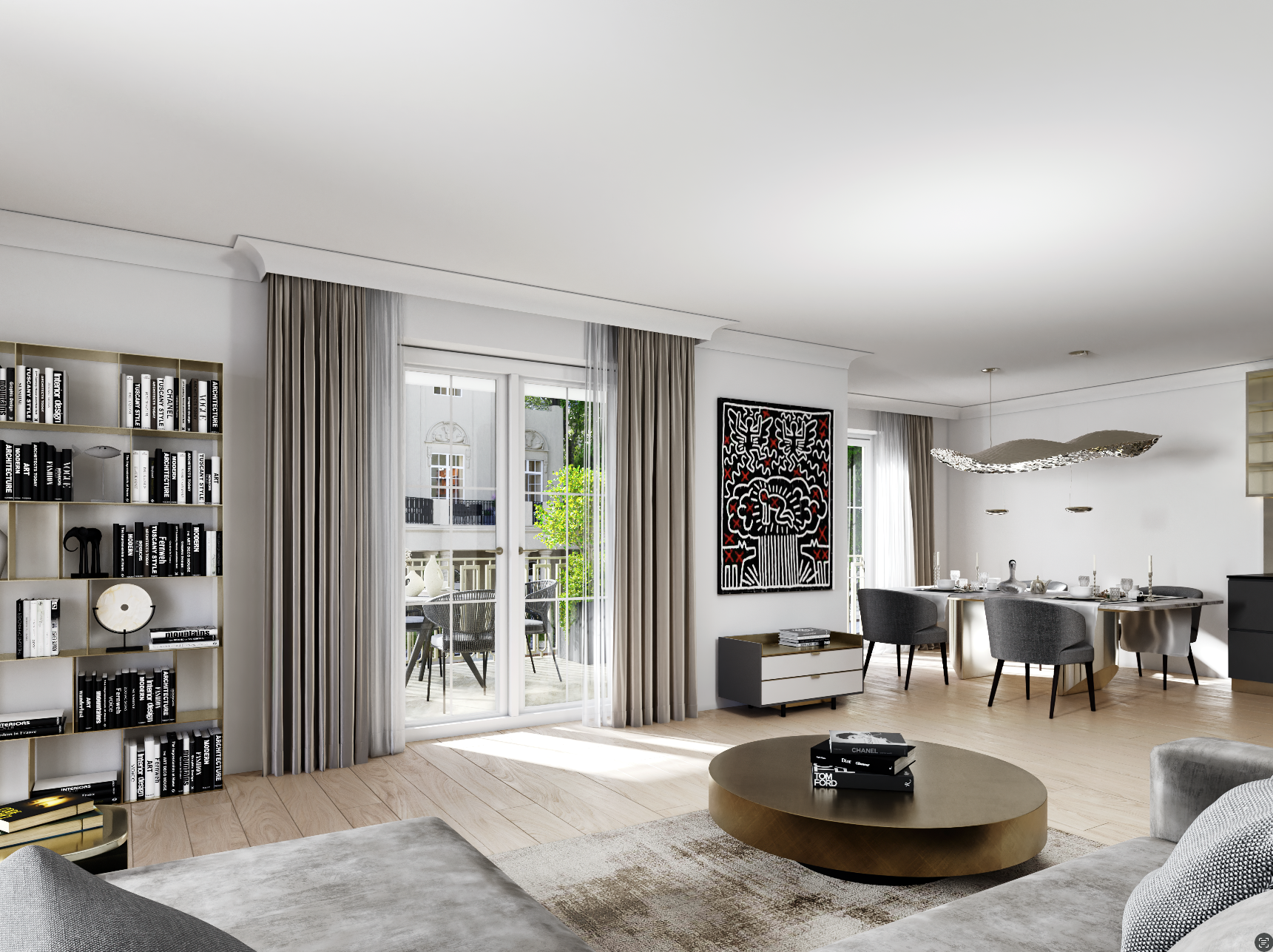 Individuelle Zugänge zu den Wohnungen im Palais unterstreichen den privaten Charakter jeder Residenz, während der malerische Blick in den weitläufigen Garten eine kontemplative Gelassenheit vermittelt.